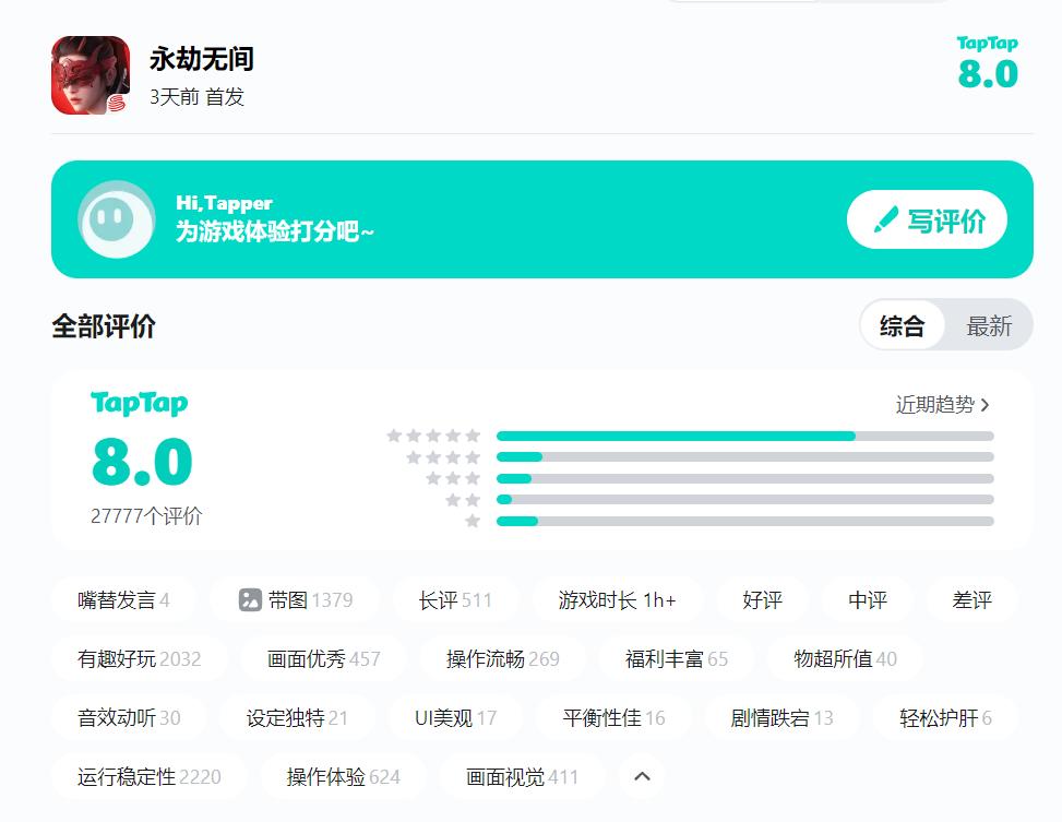 从用户口碑来看,用户评价平稳,但产品初期仅在“及格线”。截至7月28日晚上8点,《永劫无间手游》基本算是完全度过产品的第一个周末,但此时TapTap评分为8分,且上线以来正向评论始终高于负向评论。