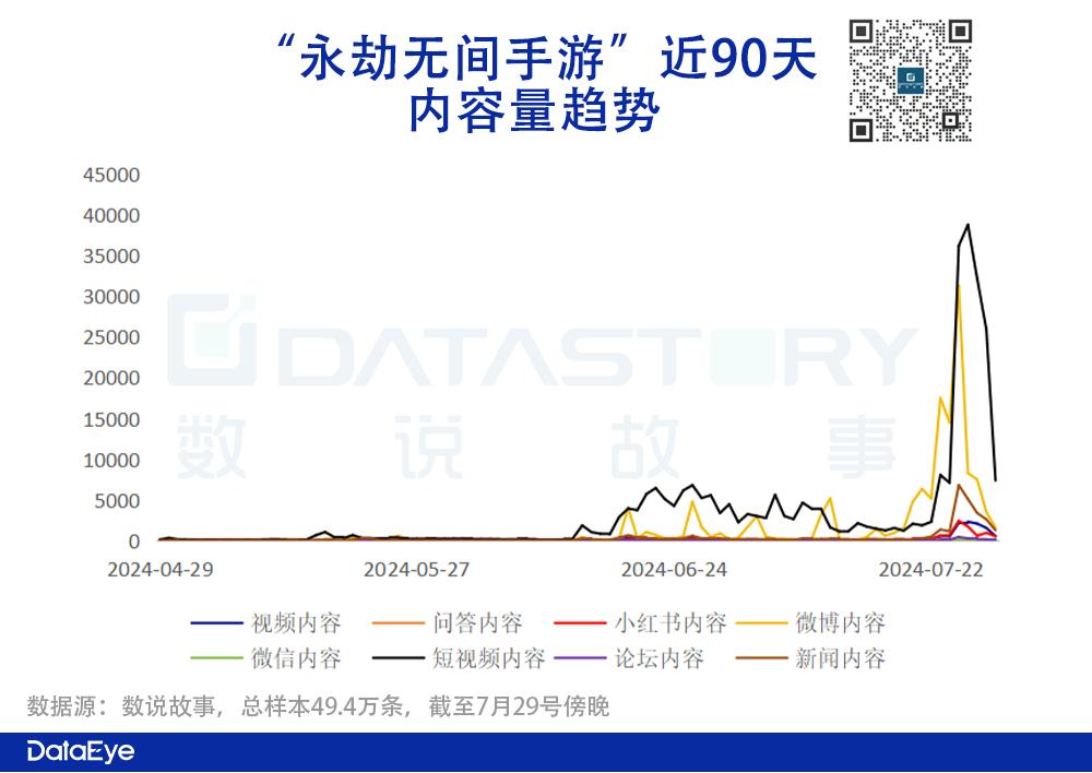 内容条数方面:截至7月29日下午,近90天国内全网“永劫无间手游”内容条数约49.4万条,其中内容主要集中在短视频平台,相比内容占比超过59%;其次是微博平台,相关内容占比接近30%。小红书和长视频平台内容合计占比大约为5%。