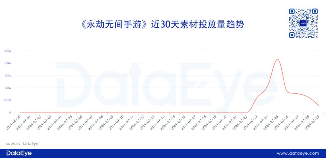 DataEye-ADX投放数据显示,《永劫无间手游》在7月22日之前基本进行测试素材投放,但日均投放量大约为25条。