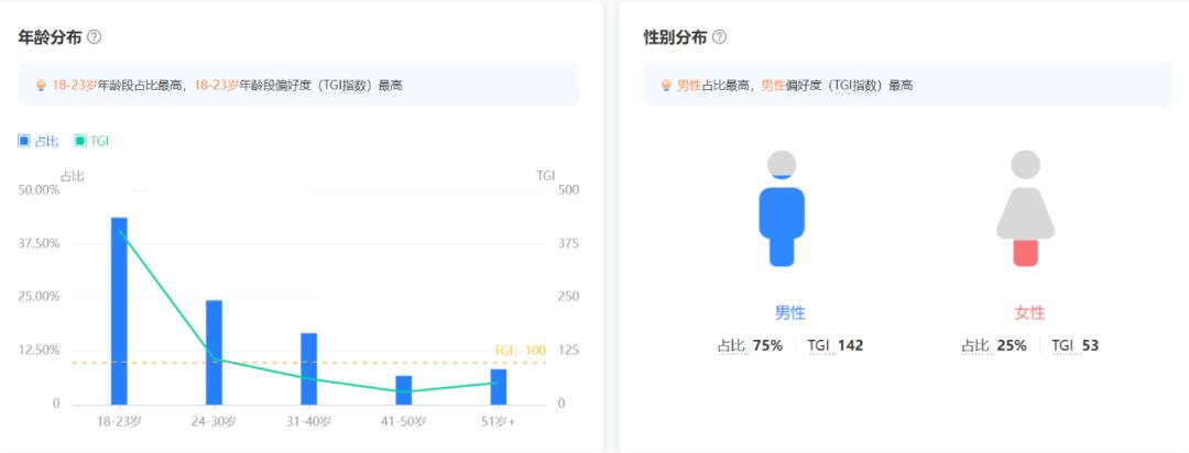 从用户画像来看,青年男性玩家为主,女性用户占比仅为25%。巨量算数数据显示,关键词“永劫无间手游”用户分布明显,其中18-23岁用户占比约为43%,而41岁以上的用户占比大约为15%。