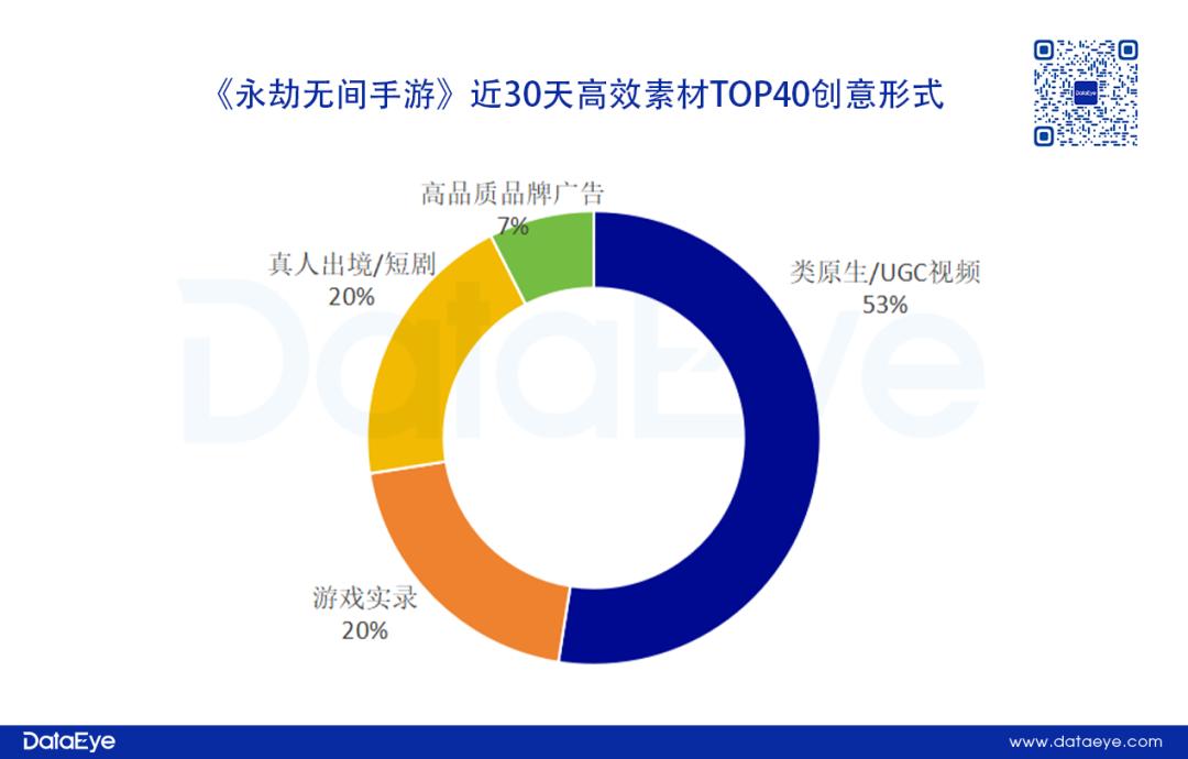从创意形式来看,类原生UGC视频形式最多,纯游戏实录占比20%。《永劫无间手游》的高效素材TOP40中,类原生UGC视频占比高达53%,主要素材通过原生画面剪辑配合旁白解说的方式制作。
