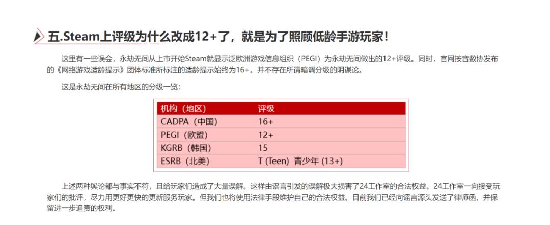 因为《永劫无间》的端游和手游是两款进度独立的游戏,但手游的宣发离不开端游的支持,包括但不限于在端游官方账号宣传手游上线信息,进行引流。而最关键的是,《永劫无间》在Steam的评级从16+调整到12+,让不少端游玩家不满。