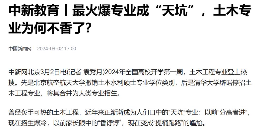 如今呢?碧桂园自身难保,还在生死线上挣扎。各大高校的土木专业分数线齐齐大跳水,甚至专业要改名为“智能建造”,家长们还唯恐避之不及。