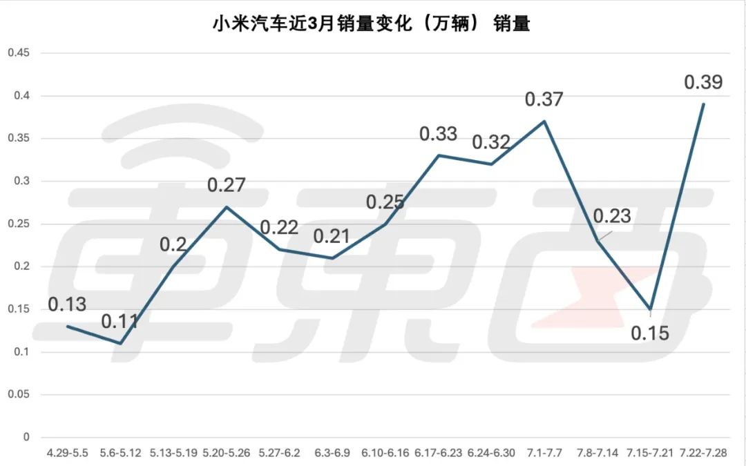 随着产线提升的结束,上周(7.22-7.28)小米汽车开始起量,达到了0.39万辆的销量,较上上周(7.15-7.21)上涨2400台,位列第五。