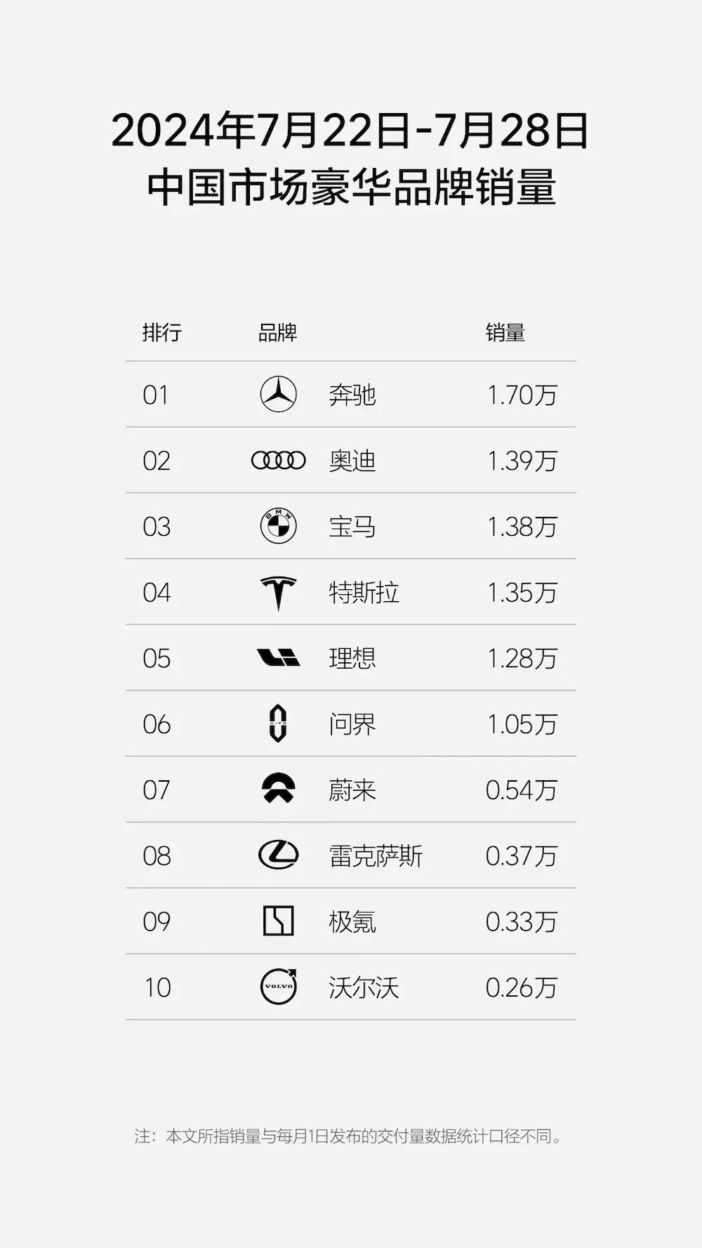 数据显示,奔驰、宝马、奥迪上周(7.22-7.28)分别卖出了1.7万辆、1.39万辆、1.38万辆。
