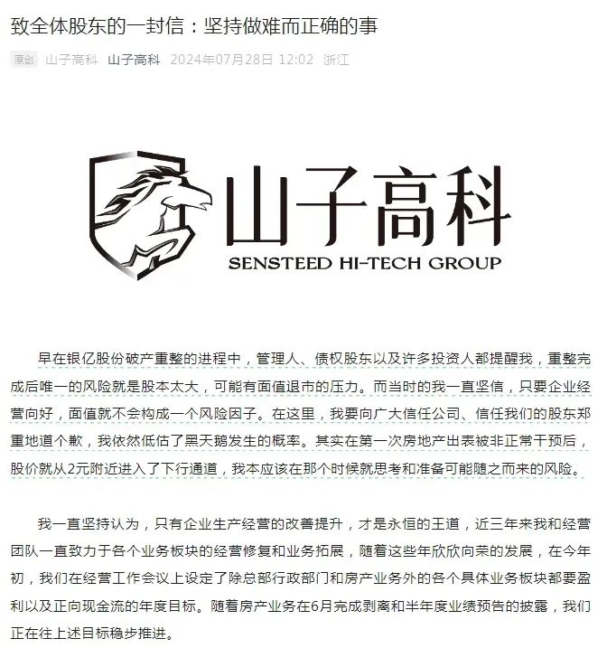 面临退市危机,山子高科官方微信公众号于7月28日发布《致全体股东的一封信:坚持做难而正确的事》一文,叶骥坦言,早在银亿股份破产重整的进程中,管理人、债权股东以及许多投资人都提醒,重整完成后唯一的风险就是股本太大,可能有面值退市的压力。