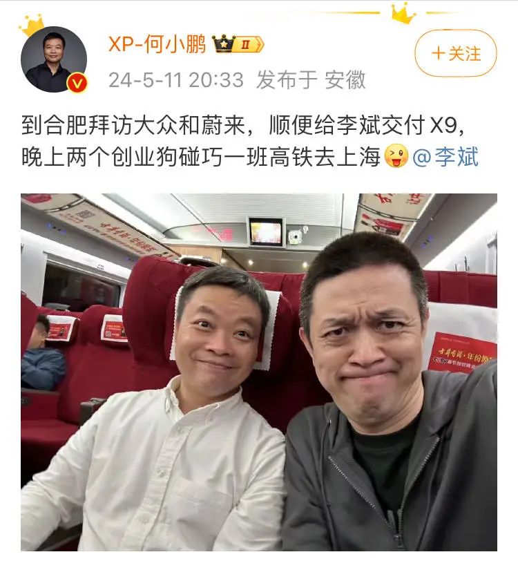 两人有时直播连线,还一同偶遇出差,何小鹏还“打骨折”把一台X9亲自交付给了李斌,后者则拉着何小鹏,要一起加电。