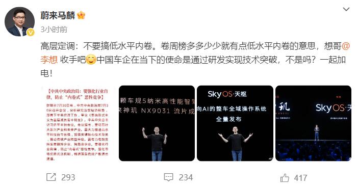 蔚来汽车公关总监马麟在微博上发文称,卷周榜是低水平内卷,并直接点名道姓@李想表示“收手吧,中国车企在当下的使命是通过研发实现技术突破,不是吗?一起加电!”