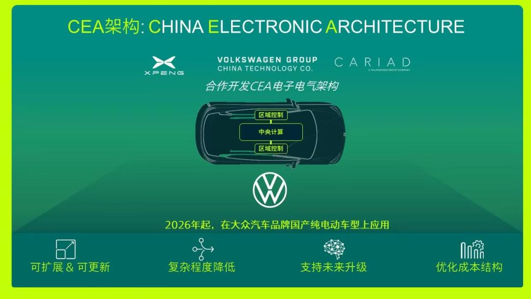 2024 年 7 月,大众和小鹏宣布共同开发 CEA 电子电气架构的合作,到 2026 年,大众品牌的 CMP 和 MEB 平台国产车型均将搭载 CEA 架构,而 CEA 也将成为大众集团在中国开发的首个本土化电子电气架构。
