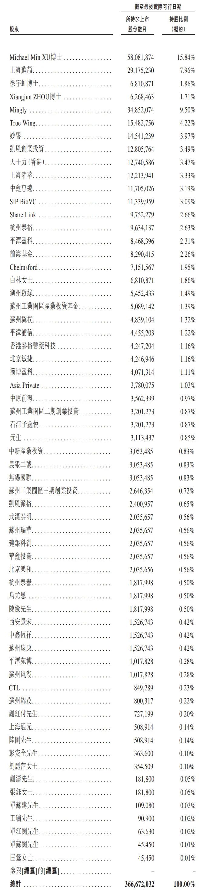 Mingly持股为9.5%,联想控股旗下TrueWing持股为4.22%,妙誉持股为3.97%,凯风创业投资持股为3.49%,天士力(香港)持股为3.47%,云锋新创旗下上海曜萃持股为3.33%,中鑫惠远持股为3.19%,元生创投旗下SIP BioVC持股为3.09%,Share Link持股为2.66%;