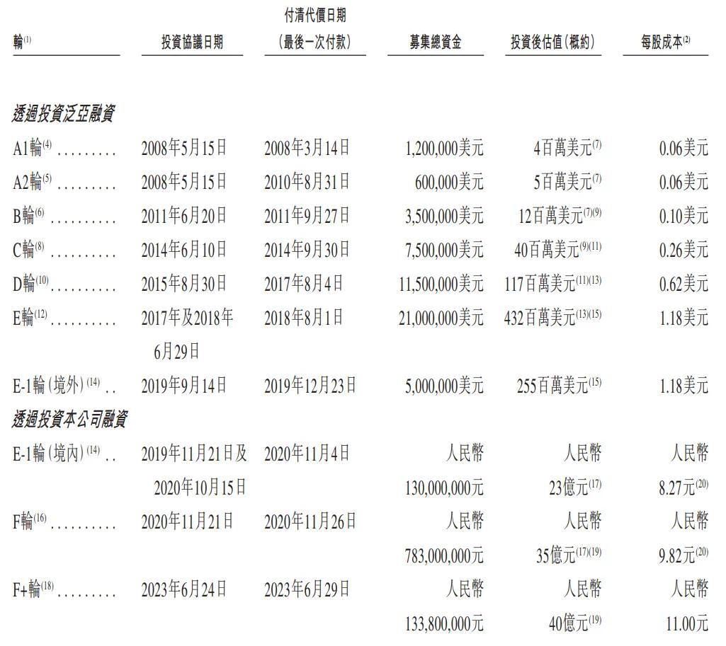 派格生物2020年11月完成F轮7.83亿元融资,投后估值35亿元,每股成本为9.82元;2023年6月完成1.34亿,投后估值40亿,每股成本为11元。