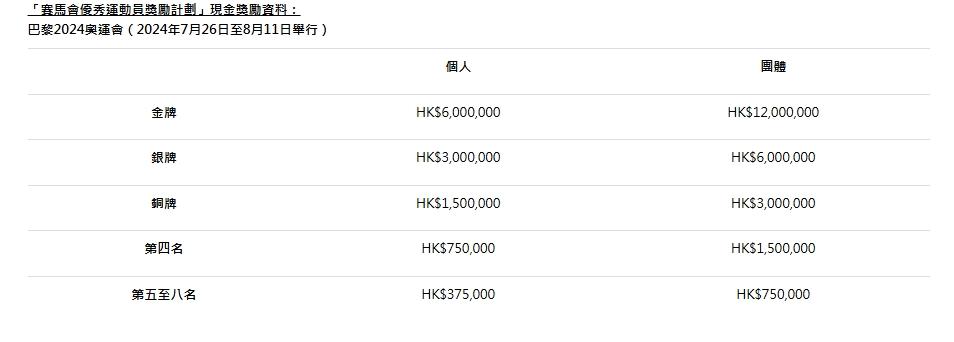 除了中国香港政府出资无数支持香港的体育和奥运事业发展之外,社会各界也慷慨解囊。在江旻憓拿下本届奥运会中国香港首金之后,香港赛马会第一时间表示祝贺并向外界表示:在巴黎奥运会夺牌或取得第四至第八名佳绩的中国香港运动员,可获得由香港赛马会赞助香港体育学院推出的“赛马会优秀运动员奖励计划”所颁发的奖金,金额较东京奥运会将增加两成,以肯定一众选手所付出的努力和汗水。