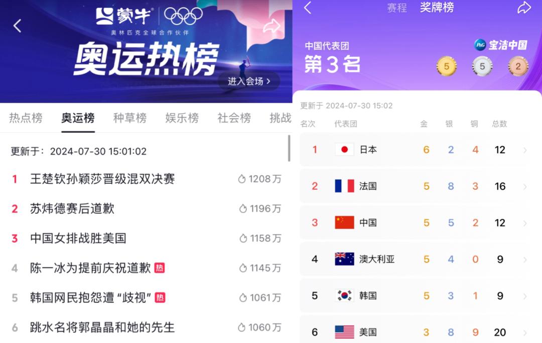 值得注意的是,抖音目前已在首页左上角「扫一扫」下方嵌入了「上抖音,看奥运」主会场入口,进入后蒙牛的品牌信息会散落在多处,且蒙牛甚至冠名了隶属于抖音热榜下的「奥运热榜」;而抖音的「奖牌榜」则由宝洁中国独家冠名,这也是咖位能与蒙牛相媲美的顶级金主了。