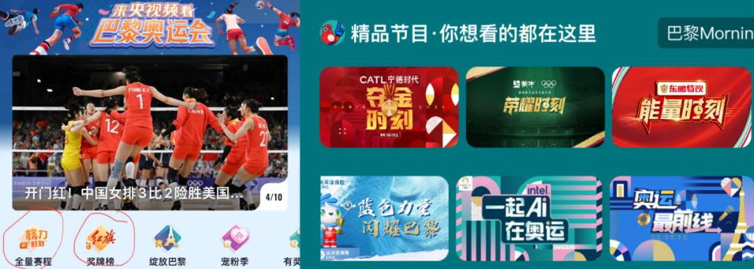 咪咕视频更是如此,几乎每个赛事小栏目人手一个冠名商,如郎平代言的宁德时代电池冠名了《夺金时刻》,东鹏特饮冠名了主打赛事高光集锦的《能量时刻》,太平洋保险冠名了游泳队专项节目《蓝色力量闪耀巴黎》,英特尔冠名了引入AI数字人分析赛事的《一起AI在奥运》,「奖牌榜」则被奥林匹克全球合作伙伴蒙牛承包了。