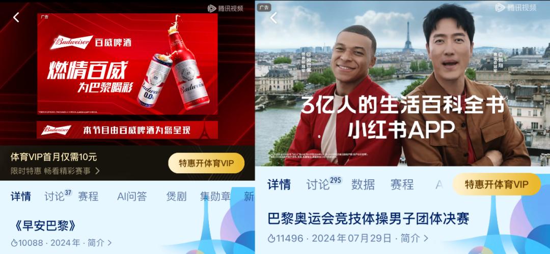 腾讯视频小栏目的品牌露出逻辑更独特,小栏目不仅被包装成微综艺,且开头会插入几秒广告更直接输送品牌信息,如伊利冠名的《中国星耀》开头就有5秒由全红婵、张雨霏等名将参演的广告。此外,东风日产冠名了《金牌时刻》、金典冠名了《法兰西进行时》、百威冠名了《早安巴黎》、小红书冠名了《风采飞扬》、皇家美素佳儿冠名了《王牌跳水》、卫龙冠名了《国球天下》、东鹏特饮同时冠名了《中国速度》《一击命中》和「奖牌榜」,换言之,只要有栏目就有品牌给它托底!
