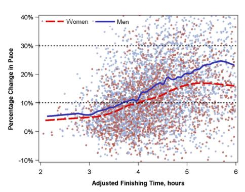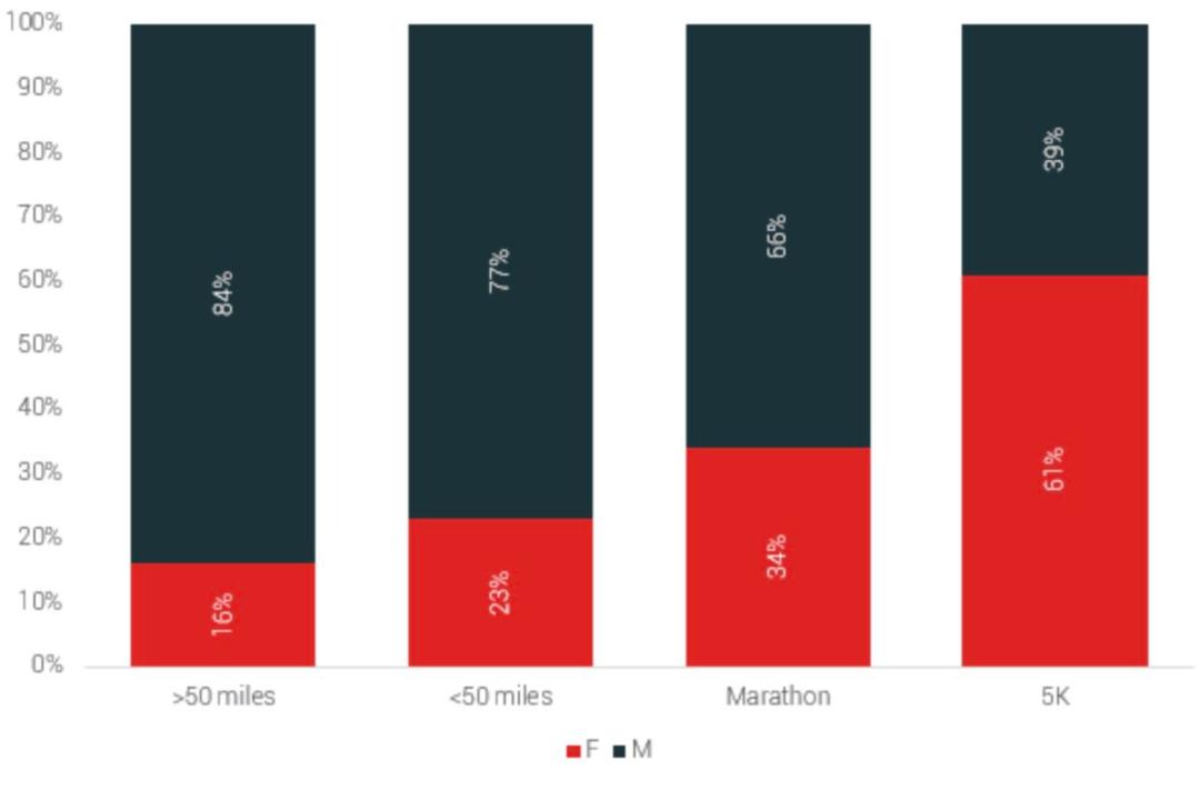 最近的一项研究针对超马拉松比赛分析显示:性别导致的运动表现差异会随着距离的增加而减弱[3]。
