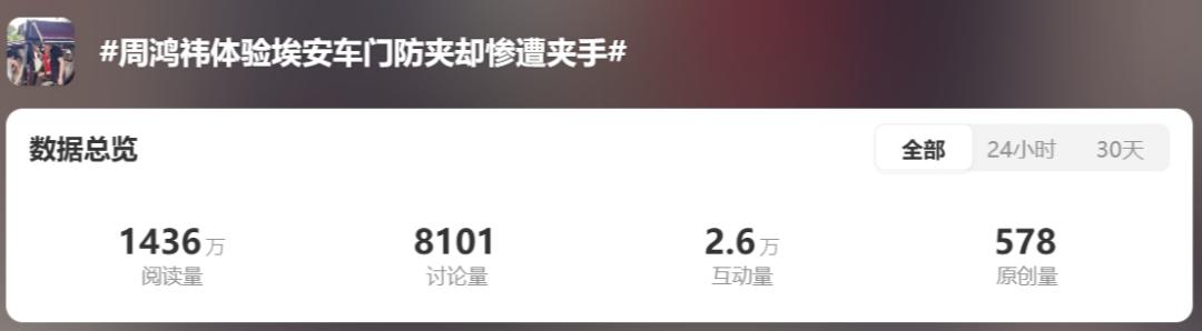 视频里,周鸿祎在体验广汽埃安昊铂 HT 车型时,亲自测试了这车的车门防夹手功能,结果,手直接被车门夹了。