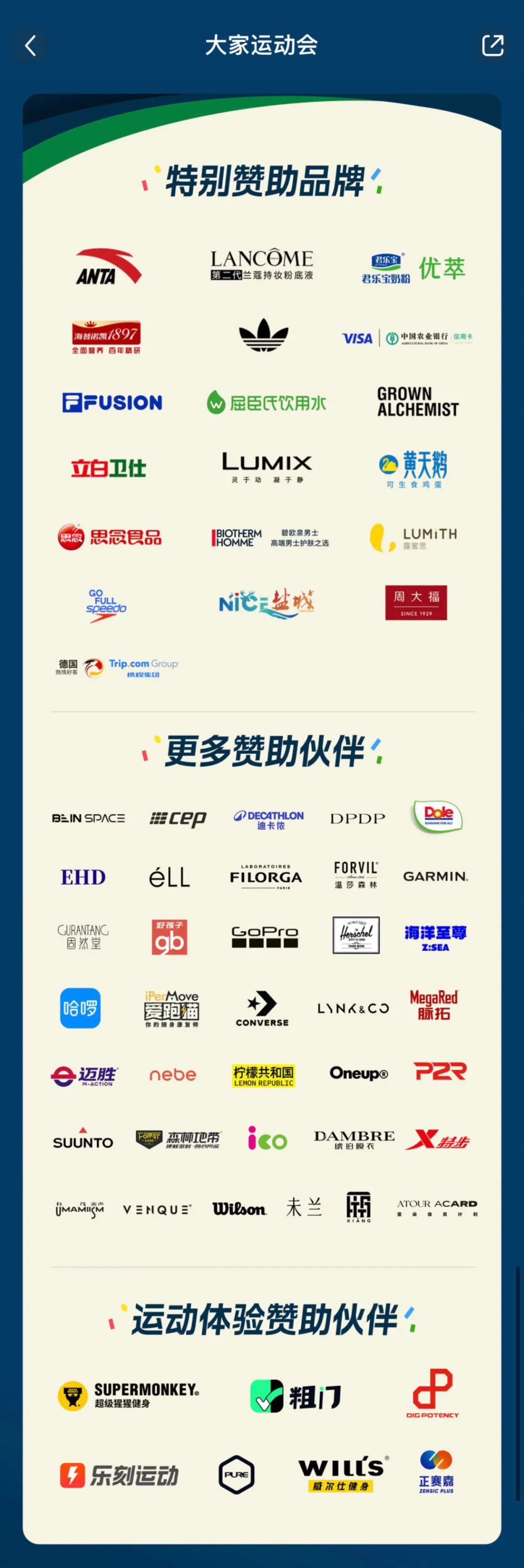 小红书的“大家运动会”页面末尾,赫然列着包括安踏、兰蔻、君乐宝等19家特别赞助品牌,还有35家“更多赞助伙伴”,以及超级猩猩、乐刻运动等6家“运动体验赞助伙伴”。虽然没有持权转播,但小红书凭借自策IP,吸引了共60家品牌的赞助。