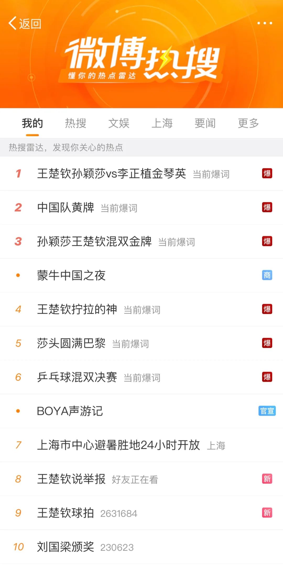 北京时间7月30日晚的乒乓球混双决赛,王楚钦/孙颖莎4-2战胜朝 鲜组合李正植/金琴英,成功夺金,振奋情绪从赛场迅速传至各社交平台,单在微博就同时爆了6个话题。