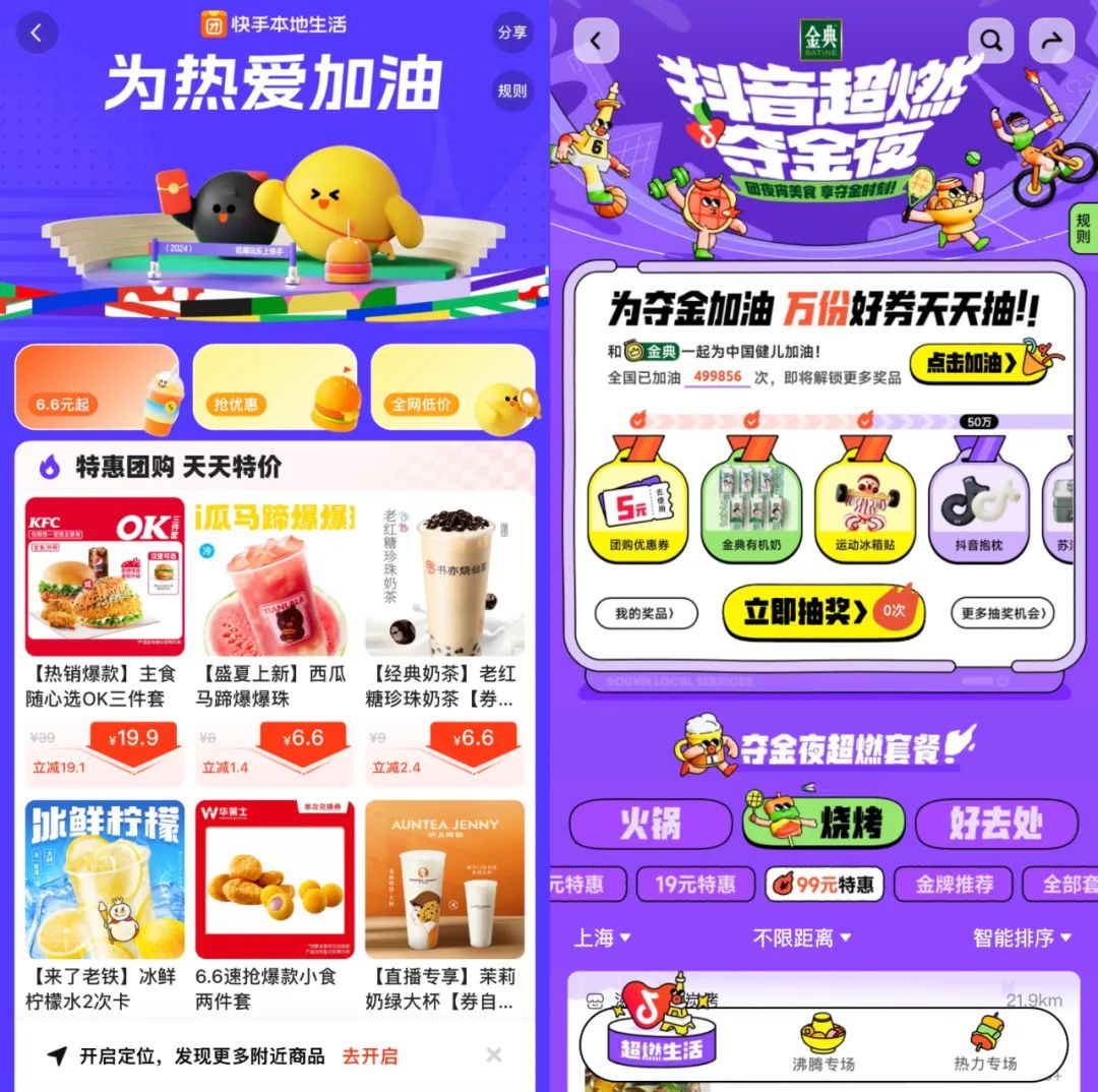快手依然是IP为导向,在奥运主会场的团购板块结合了快手本地生活营销IP之一“66特惠团”,并上线了“敢比价”和“大牌上新”两大频道。