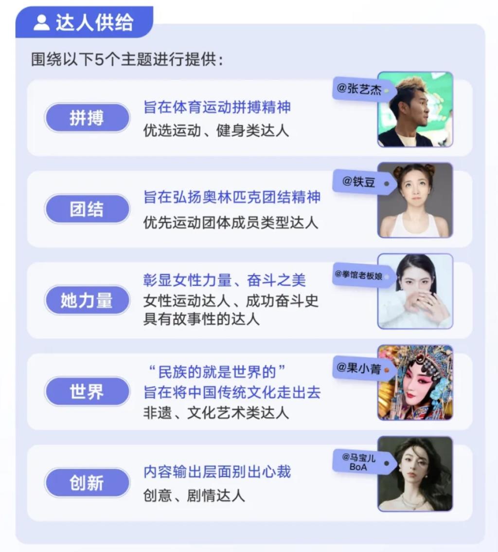 抖音则是结合站内达人生态,打造有共鸣的内容,讲一个平台、用户、运动员均受益的好故事。