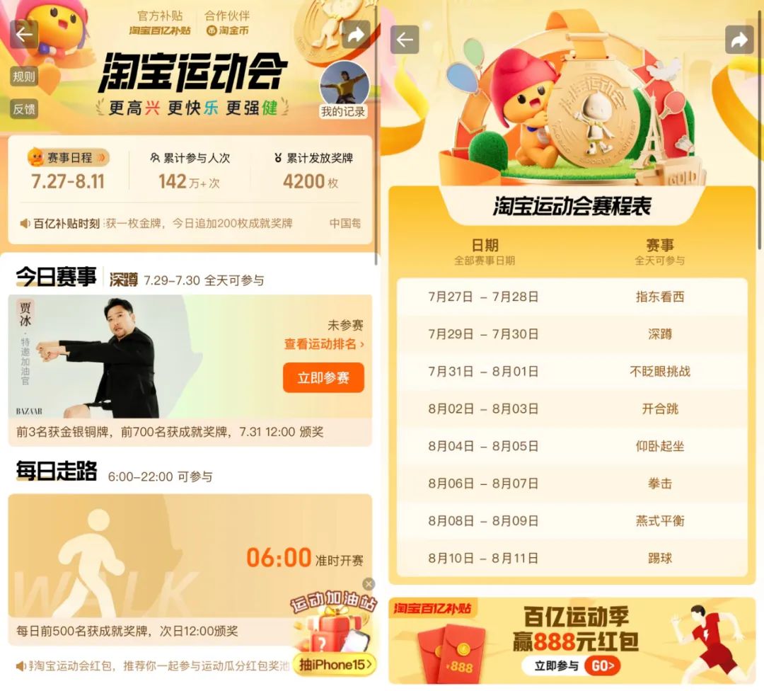 淘宝和抖音分别推出的“热力先锋季”和“冲奥季”,在淘宝“冲奥季”页面,纳入了天猫U先、88VIP、百亿补贴等IP的入口,并官方直播间带货观赛设备、冲奥饮品等。