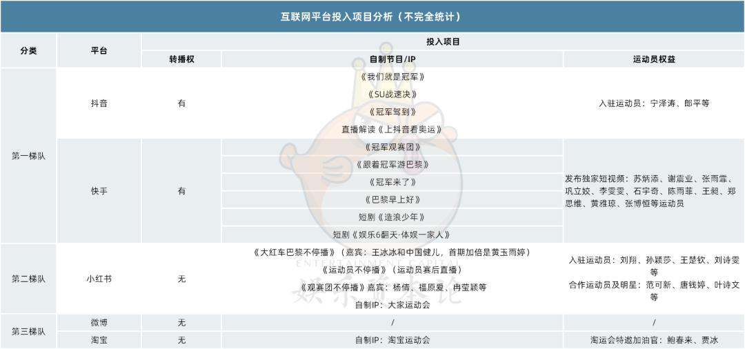 先来看各个平台真金白银的投入,根据转播权、自制节目、运动员合作权益等,可以粗略地将平台的投入分级。