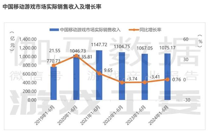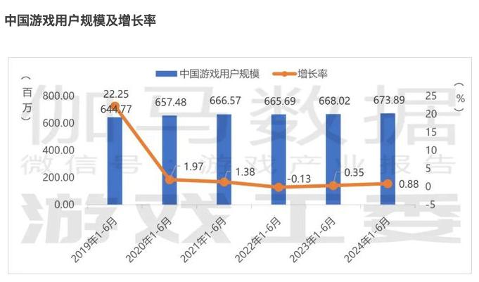 据《2024年1-6月中国游戏产业报告》数据,今年上半年游戏市场用户规模6.74亿人,同比增长0.88%,收入占比最高的移动游戏市场1-6月实销收入1075.17亿元,同比增长仅有0.76%。