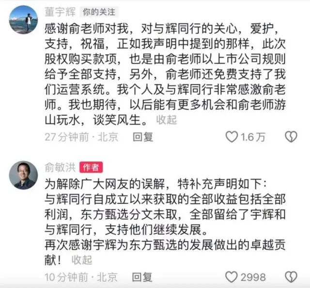 东方甄选的公告显示,董宇辉同意7658.55万元收购“与辉同行”公司100%股权。这笔钱的来源,俞敏洪也在个人抖音账号里进行了解答:“宇辉购买公司的钱我安排了,公司是送给宇辉的。”俞敏洪还表示,“与辉同行”自成立以来获取的全部收益包括全部利润,东方甄选分文未取,全部留给了董宇辉和“与辉同行”,支持他们继续发展。