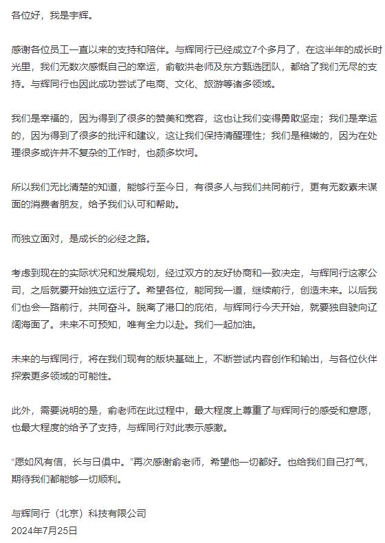 关于本次离职事件,俞敏洪在最新的股东信中给出了答案“复杂的是,作为一个以互联网为依托的企业,舆论力量常常影响到公司的发展。尽管我和宇辉之间的沟通,至今没有任何障碍,但复杂的舆论纷争,加上少数别有用心的力量的引导和造谣,直接导致东方甄选和‘与辉同行’的隔阂。”