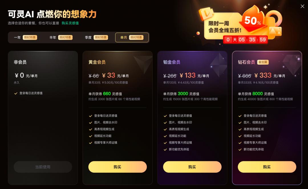 目前大多数AI视频生成工具,面向C端用户采用的是会员体系。以可灵为例,其目前会员共分为黄金、铂金、钻石三个类别,优惠后三档月卡的价格分别为33元、133元和333元,对应分别获得660、3000 、8000“灵感值”,可生成约66个、300个或800个标准视频。