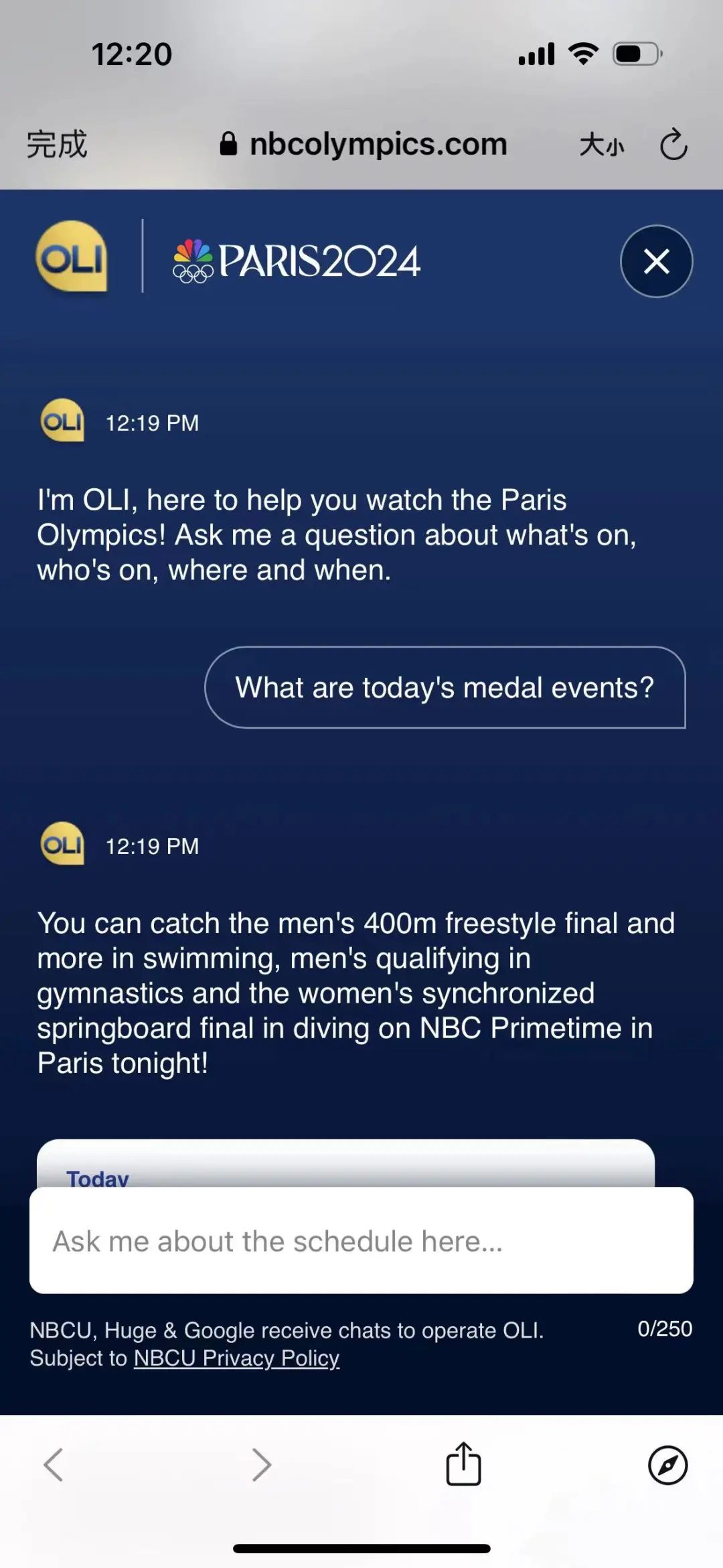在NBCU网页上,OLI以对话的方式事无巨细地告诉观众,何时何地可以通过NBCU的广播、有线频道以及流媒体服务,观看现场奥运会赛事,以及如何找到特定运动员、团队和国家的报道。