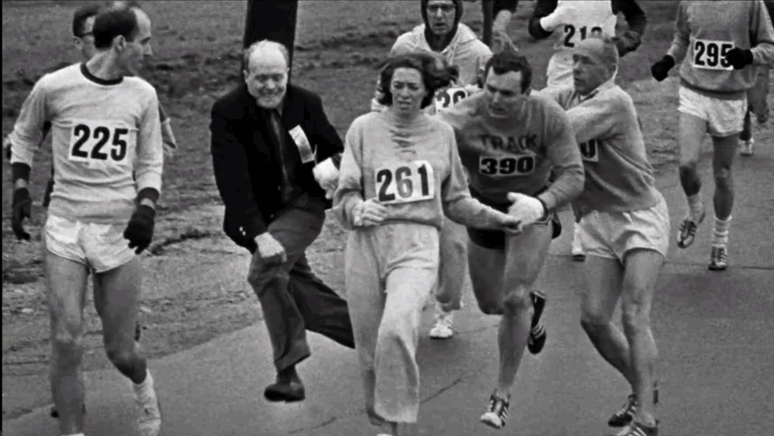 凯瑟琳·斯威策(Kathrine Switzer),美国马拉松运动员。1967 年她不顾选手和裁判的阻挠,勇敢地挂着261号码牌,成为第一位正式参加波士顿马拉松的女性,并推动女子马拉松被列入1984年奥运会。
