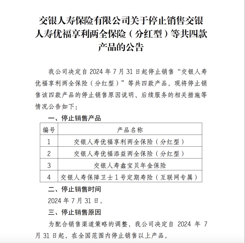 7月26日,交银人寿公告称,为配合销售渠道策略的调整,公司决定自2024年7月31日起,在全国范围内停止销售以下四款产品:交银人寿鑫宝贝年金保险、交银人寿保障卫士1号定期寿险(互联网专属)、交银人寿优福享利两全保险(分红型)、交银人寿优福添益两全保险(分红型)。
