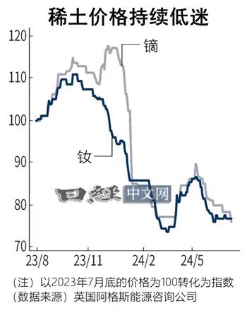 虽然中国对稀土供应链进行严格管理,但稀土市场价格的下跌态势仍然很明显。据英国调查公司阿格斯能源咨询(Argus Media)称,截止到7月11日,钕价比2023年7月底下跌23%,镝价下跌24%。