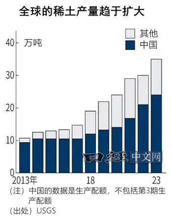 据美国地质调查局(USGS)的数据,2010年代前半期中国在稀土生产中的占比为8~9成,但到了2023年降至7成左右。同年的全球产量约为35万吨,是2013年的3倍多,稀土也不再像过去那样“稀有”。