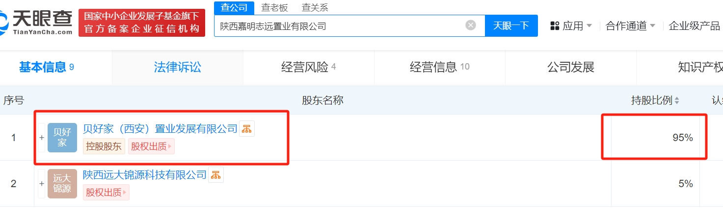 本次贝好家在西安拿地,则是通过子公司陕西嘉明志远置业有限公司直接参与。陕西嘉明志远的股东方中,贝好家(西安)置业发展有限公司持股95%,另一股东方陕西远大锦源科技有限公司持股5%。经过股权穿透之后,陕西远大锦源与贝好家并无归属关系,但子公司陕西嘉明志远的注册地和陕西远大锦源为同一地址,两者注册成立时间分别为2024年1月、2019年11月,可见两家企业在今年年初已经做好了拿地准备。
