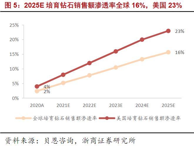 培育钻石销售额渗透率 资料来源:贝恩咨询,浙商证券研究所