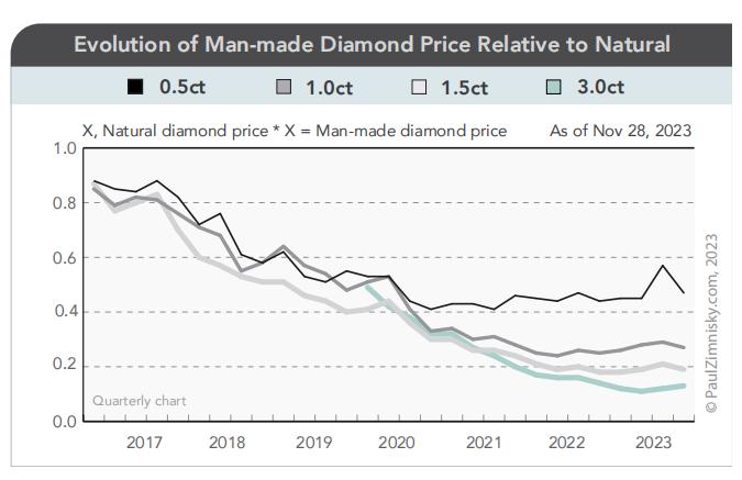 2016年起,培育钻石的价格为天然钻石的80%。2020年,已降至天然钻石的35%。