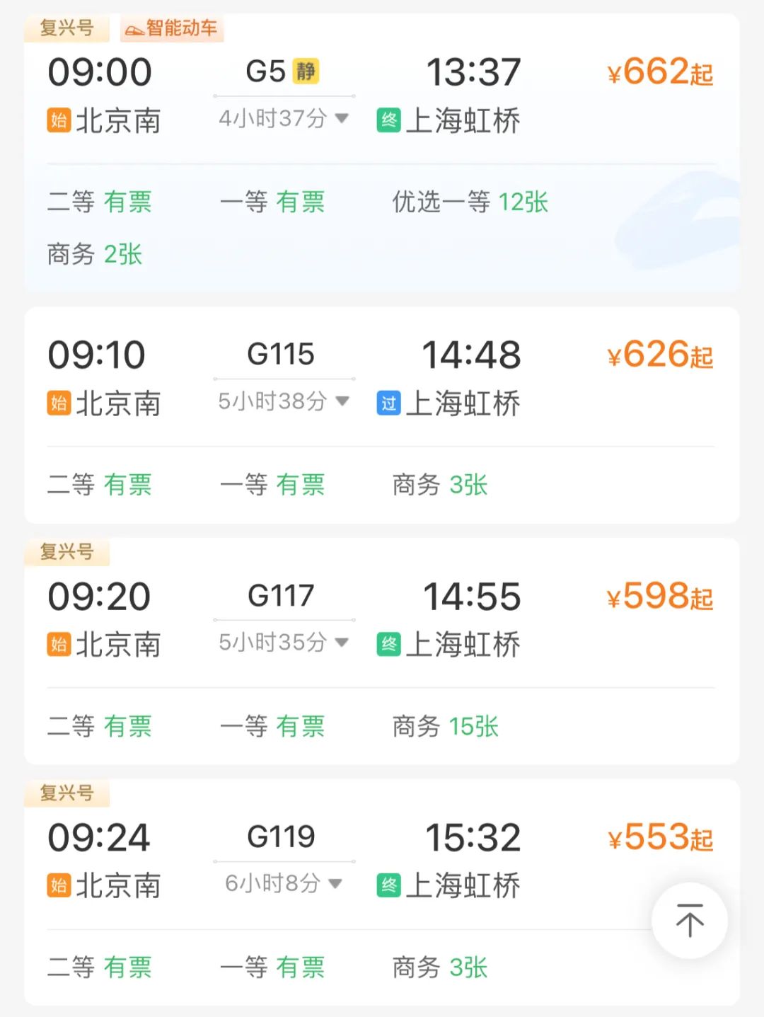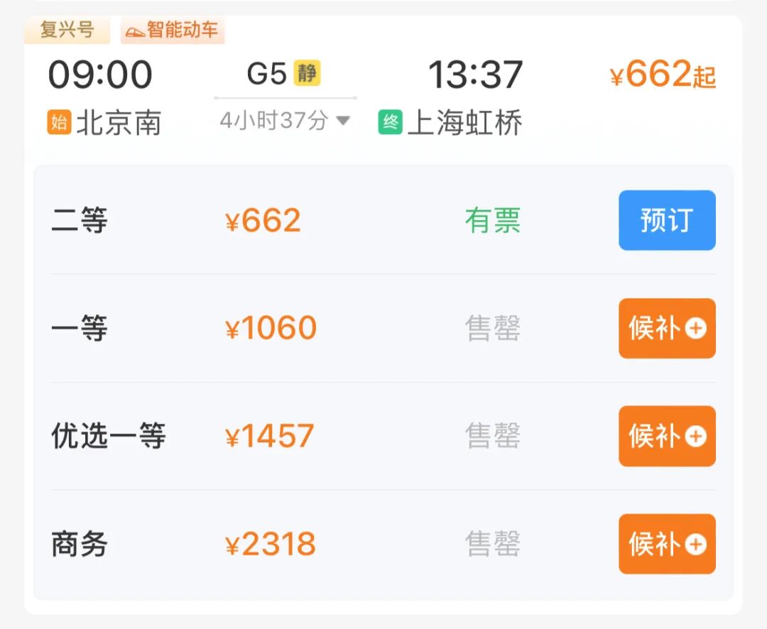 但京沪高铁是个例外,没票的一般是一等座和商务座。