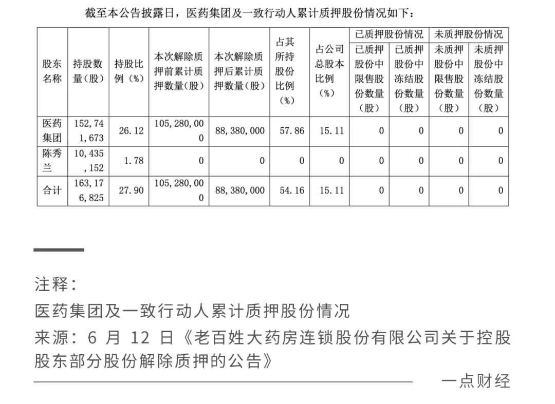 同时,他也是老百姓大药房的实际控制人。2024年6月的一份解质公告显示,谢子龙、陈秀兰夫妇通过老百姓医药集团有限公司控制老百姓26.12%股权,此外,陈秀兰直接持有老百姓1.78%股权,合计持股27.90%。