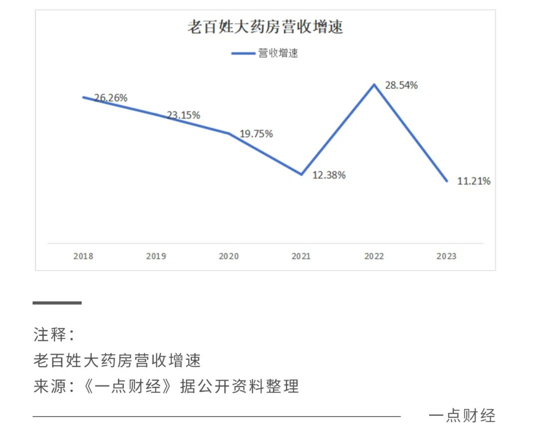 但纵向对比可以发现,这是其自2018年以来的最低增速。2018-2022年,老百姓的营业收入增速分别为26.26%、23.15%、19.75%、12.38%、28.54%。