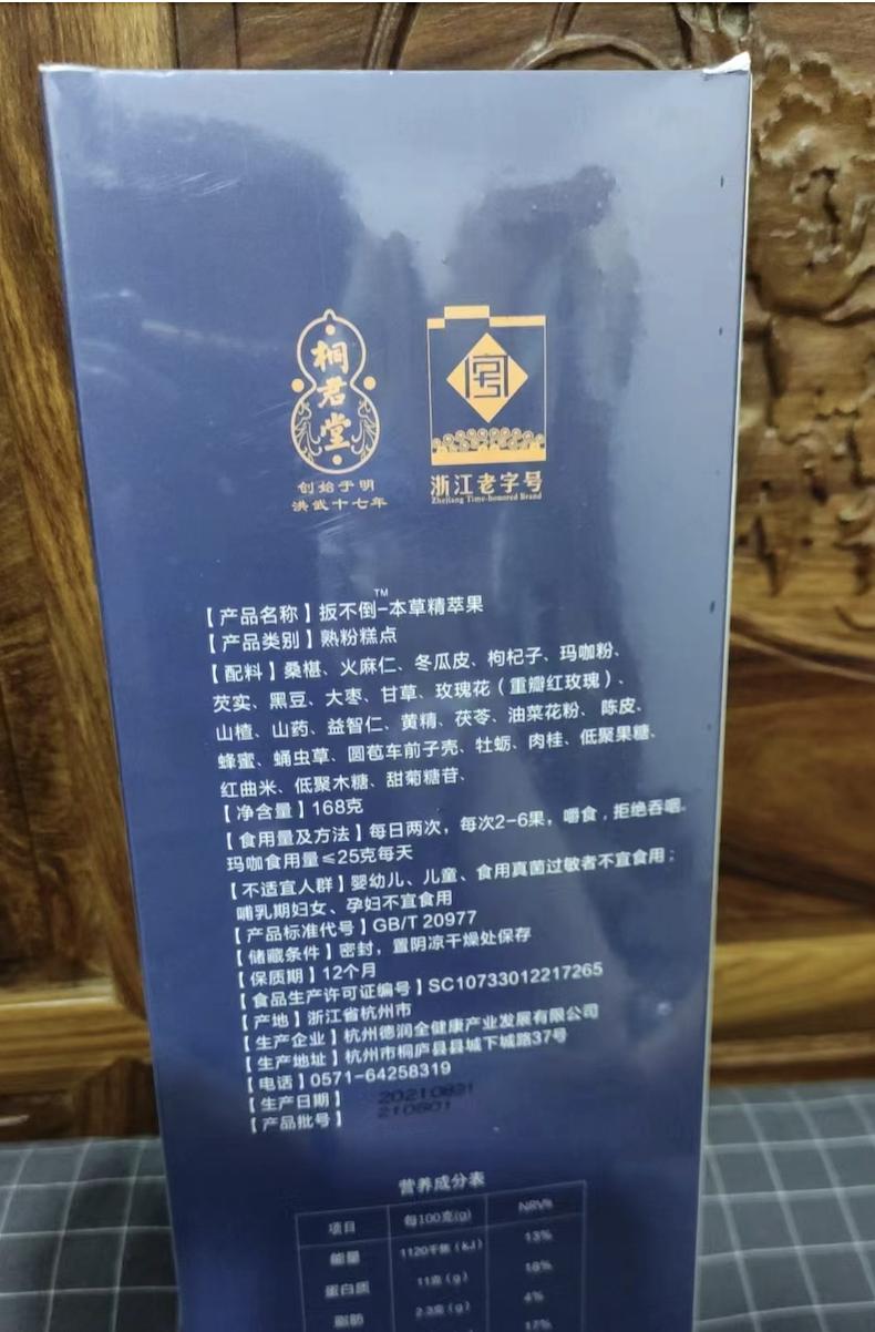 例如,一款以桑椹、火麻仁、冬瓜皮、枸杞子、玛咖粉等为主要原料的熟粉糕点,包装为“扳不倒”本草精粹果,在“买卖通”售价350元。