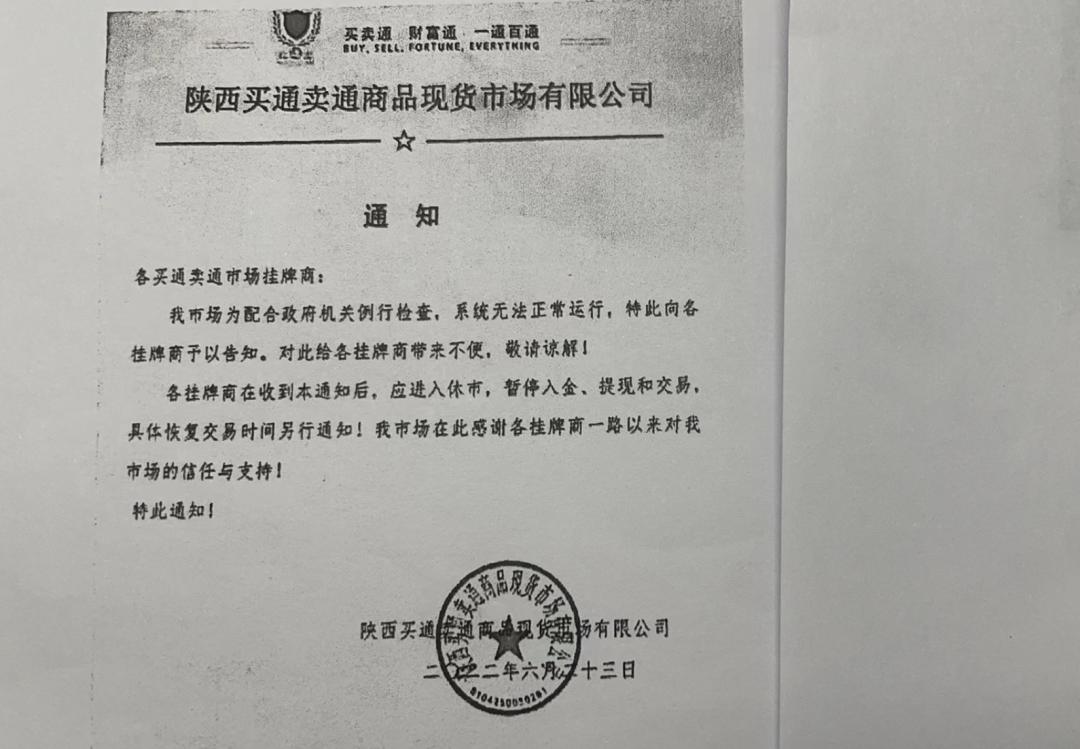 直到2022年6月23日,买通卖通公司发出一份通知,称“平台进入休市”。有“会员”打开“买卖通”后看到弹窗的消息,也有人在名为“买通卖通官方”的微信公众号上收到推送(文章现已删除)。