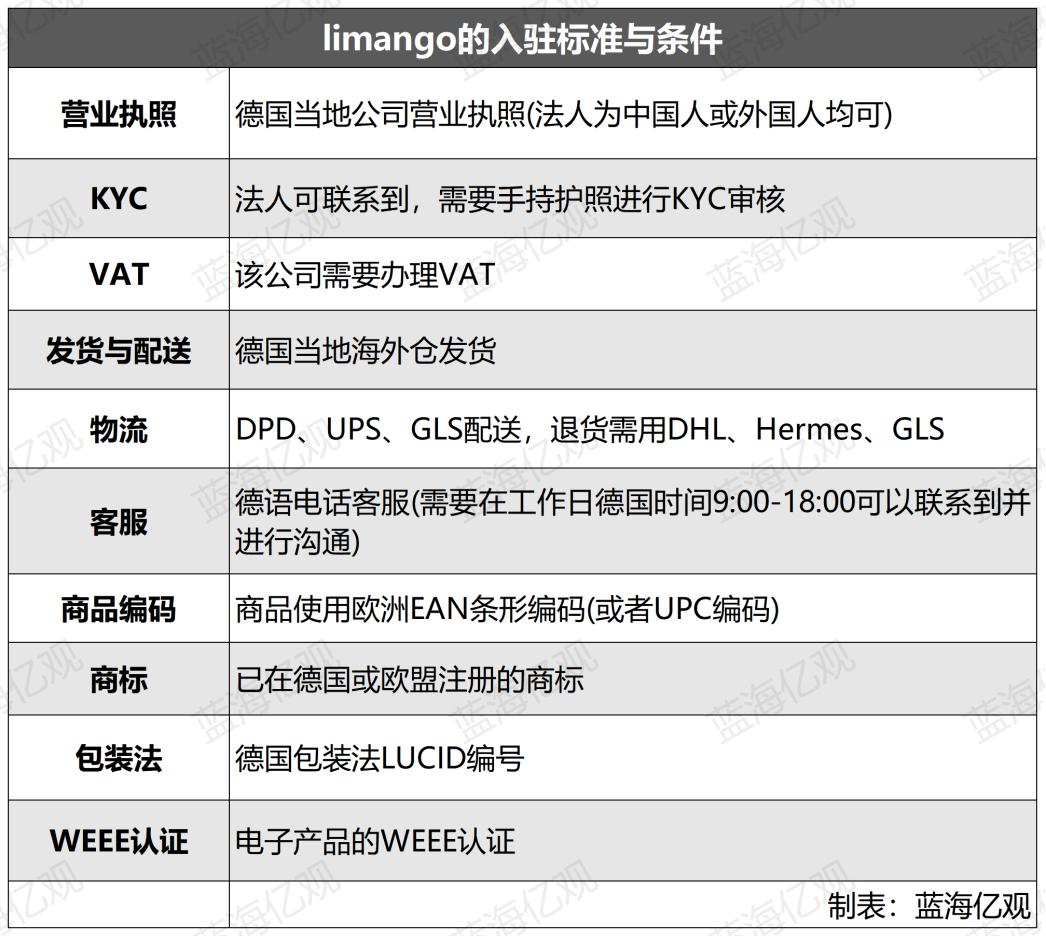 limango面向中国卖家的招商条件包括:一、需要德国营业执照,中国人也可以做公司法人;二、需要办理VAT、法人配合进行KYC审核等;二、商品在德国当地海外仓发货等。具体如下表: