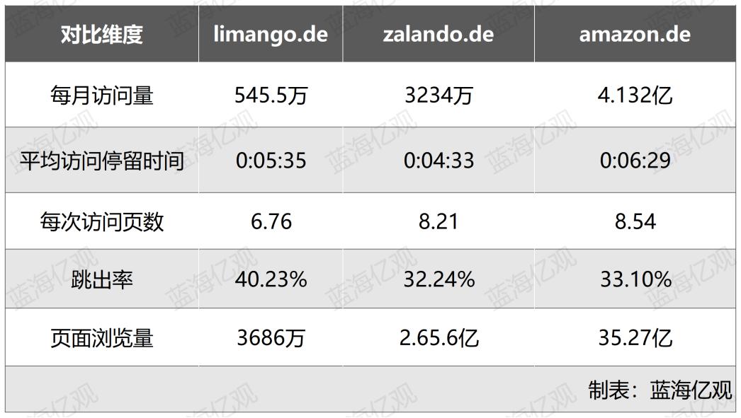 「蓝海亿观」将其跟Zalando和亚马逊德国站进行了粗略对比和评估。