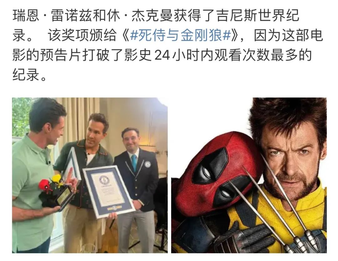 《死侍与金刚狼》的庞大宣发攻势也早早开启。在2月11日“超级碗”发布首款电影预告后,24小时内在不同平台便获得超过3.65亿次的全球观看次数,刷新吉尼斯世界纪录。4月份《死侍与金刚狼》又在CinemaCon上释出独家片段,肖恩·利维还得到“年度导演”的肯定,并在月底放出第二支预告片。