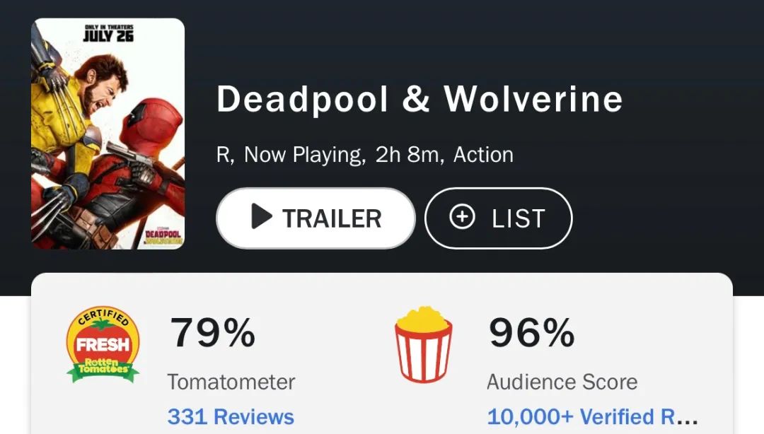 据EntTelligence披露,《死侍与金刚狼》的售票总数达到1360万,比去年《芭比》同期还多出50万张。在2020年后,仅有《蜘蛛侠:英雄无归》(逾2千万)和《奇异博士2:失控多元宇宙》(1380万)的数字更高。