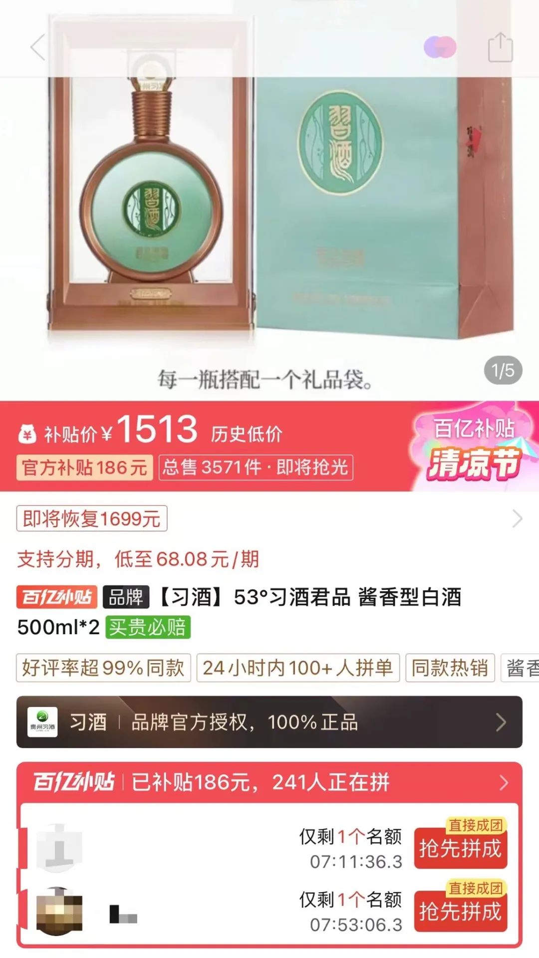 从电商平台来看,线上渠道的到手价更便宜。在拼多多上,有显示为习酒官方授权的店铺通过百亿补贴的方式,2瓶500ml、53度的君品习酒的团购价为1513元,平均每瓶为756.5元。