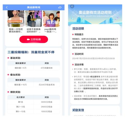 奥运会期间,带话题 #奥运剧有戏 发布与奥运相关的原创视频即可参与奖励分配。《夺冠之华丽逆袭》《奥运之夺冠时刻》《造浪少年》等短剧均带上了该话题,在快手内热度较好。